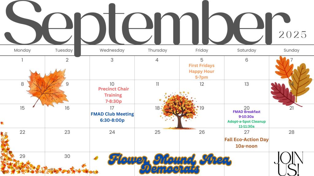 What: Come eat breakfast and socialize with your fellow Democrats. Look in the back room for a long table of fellow Democrats drinking coffee and ordering up all the breakfast goodies. Let us know you’re coming here: FMAD Breakfast Club And join us immediately afterward as we head over to our club’s Adopt-a-Spot to spend a couple minutes tidying it up. It takes less than 30 minutes to clean, it helps keep Flower Mound beautiful, and many hands make light work.