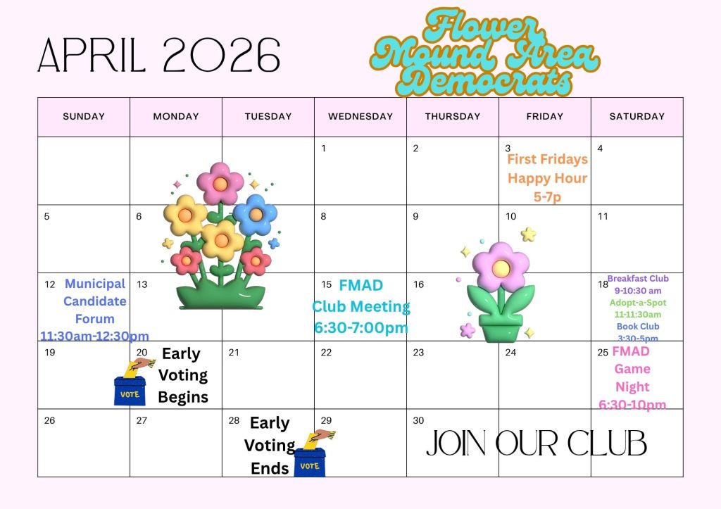 We’ve got a great calendar of events for you for the month of April. Our First Friday’s Happy Hour is at the top of this month and most every month. It’s always a good time. On the 12th, we’ll be hosting a Candidate Forum for some of our Municipal Candidates for Flower Mound Town Council. Lewisville City Council, Highland Village City Council, and LISD School Board. At our monthly club meeting — the third Wednesday of most every month — several of our current School Board members will be joining us for an informative panel discussion on the issues facing our schools and school board. Breakfast Club, Game Night, & Book Club are great places to plug in and get to know your fellow dems better. And we have our upcoming Municipal elections to vote in. So scroll on down to see our upcoming events & make your plans to jump in & join us! You can also find all of this information and more on our website: www.flowermoundareademocrats.org, our club’s Flower Mound Area Democrats private Facebook group https://www.facebook.com/groups/flowermounddemocrats, and the DCDP’s event page DCDP Eventshttps://www.dentondemocrats.org/events.